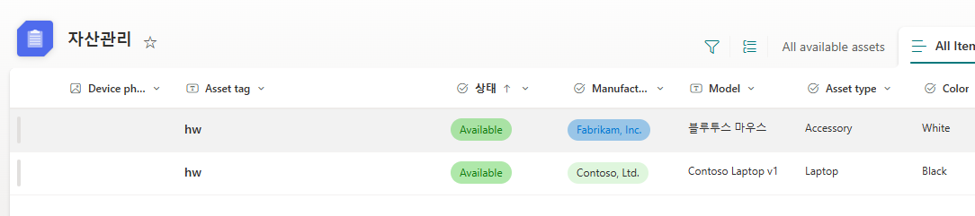 목록이 검색을 위해서 Power Automate 로 호출을 하기위해 다음과 같이 자산관리 목록에 데이터가 있다고 가정하고