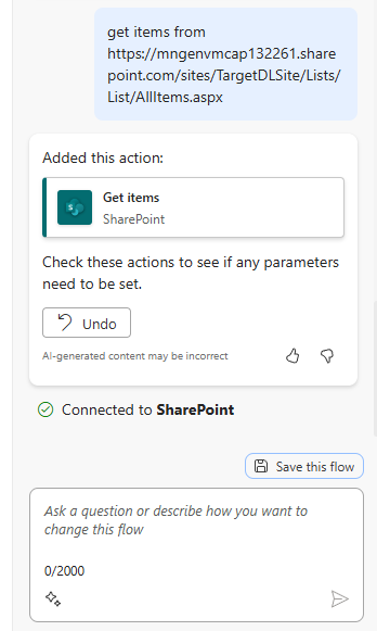Power Automate 화면의 Copilot 프롬프트에 다음과 같이 입력하여 SharePoint 목록 조회하는 단계를 추가