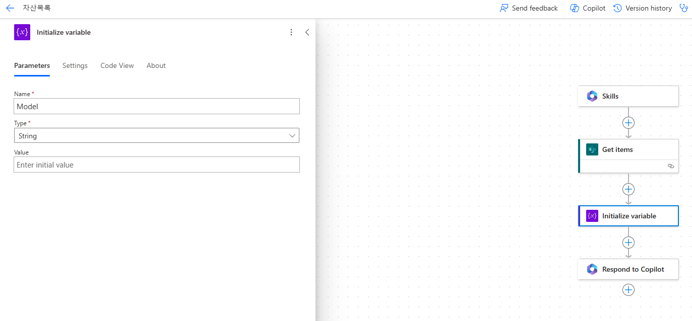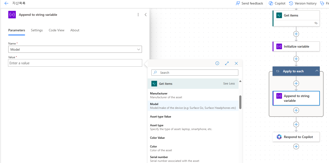 Apply to Each 추가 후 Append to string variable 에 Model 설정