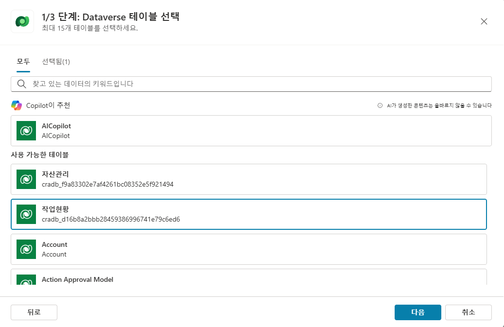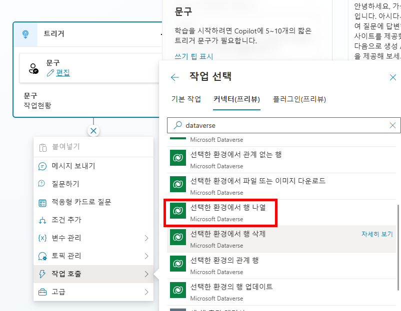 Power Automate 화면의 Copilot 프롬프트에 다음과 같이 입력하여 SharePoint 목록 조회하는 단계를 추가