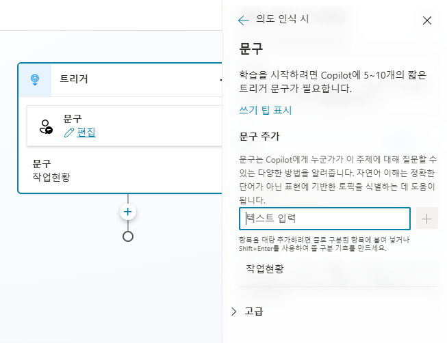 토픽추가에서 트리거 구문을 지정(생성형 AI 인 경우 능동형으로 작성)